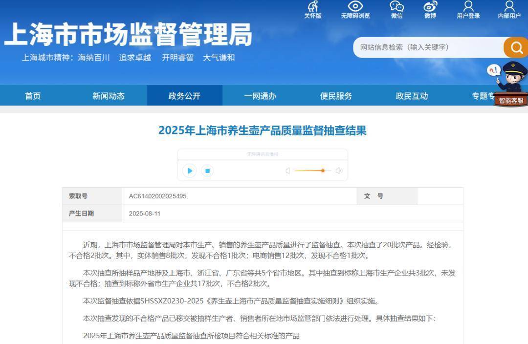 8月11日,上海市市场监督管理局发布《2025年上海市养生壶产品质量监督抽查结果》,上海市市场监督管理局对当地生产、销售的养生壶产品质量,进行了监督抽查。